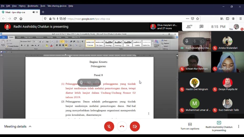 Selanjutnya, perubahan pasal 8 ayat 1 terkait pelanggaran teknis yang dilakukan. Dilakukan penghapusan penjelasan poin-poin apa saja yang menjadi tolak ukur pelanggaran yang dilakukan, penjelasan tersebut kemudian dijelaskan pada pasal berikutnya. Perubahan lain yang dilakukan adalah perubahan terkait tanggal dan waktu. Pada akhir pembahasan, diberikan kesempatan untuk kuorum menyampaikan usul dan saran. Terdapat beberapa usul dan saran yang masu, terkait bagaimana sebaiknya perubahan ini dilakukan.