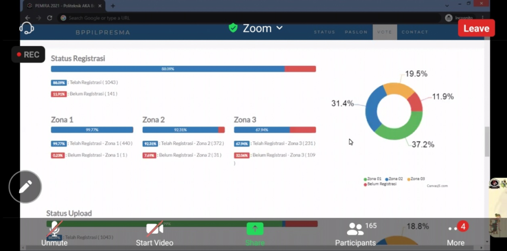 Jurnalikanews – Badan Pekerja Pemilihan Presiden Mahasiwa (BP Pilpresma) mengadakan acara rekapitulasi perhitungan suara yang diraih oleh paslon pada Minggu (09/01/2021) pukul 20.30 WIB setelah sebelumnya telah dilaksanakan E-Voting yang diadakan pada hari yang sama pada pukul 07.00 WIB. Acara ini dilaksanakan secara dalam jaringan melalui aplikasi Zoom dan dihadiri lebih dari 150 partisipan.